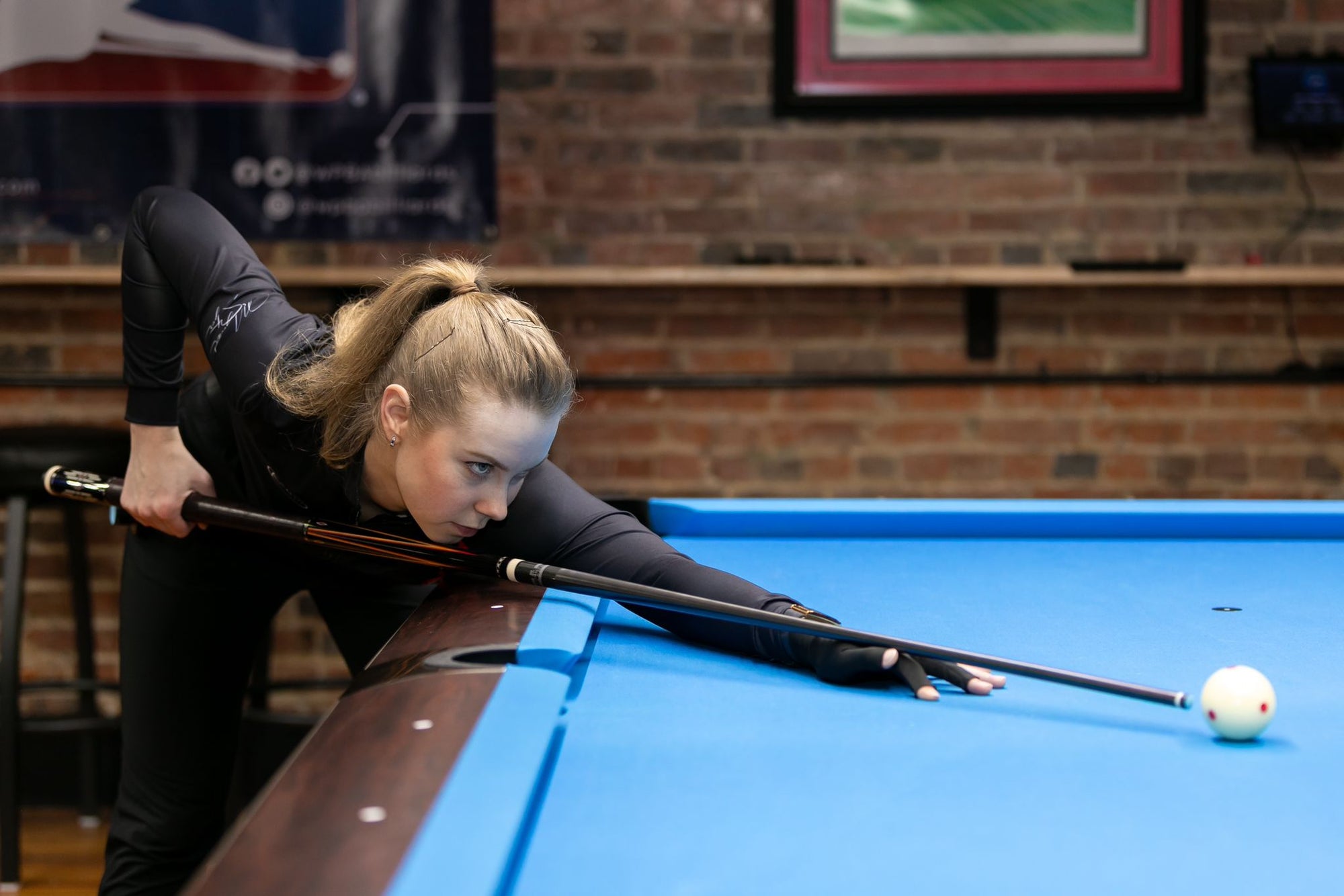 KODA KD55 No Wrap Pool Cue - Black-Stained Maple with White Points and Blue Inlay Graphic