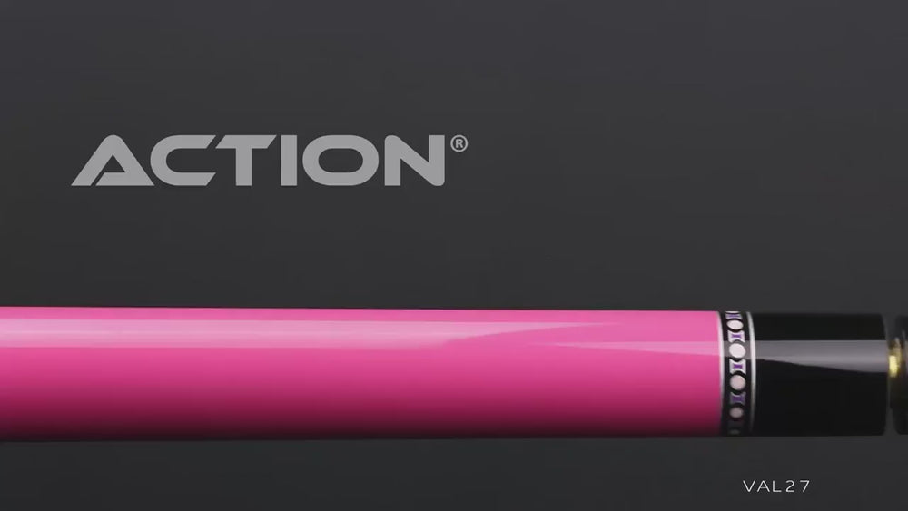 The Action Cues Value Pink with Silver Rings is a cue designed with all players in mind whether you are a beginner, intermediate, or league pro. High quality materials, craftsmanship, and price come together in an Action Cue, offering players wide assortments of exotic materials, stains, designs, and inlays. All Action Cues are backed by a one-year warranty against all manufacturer's defects. The Action Cue features:
