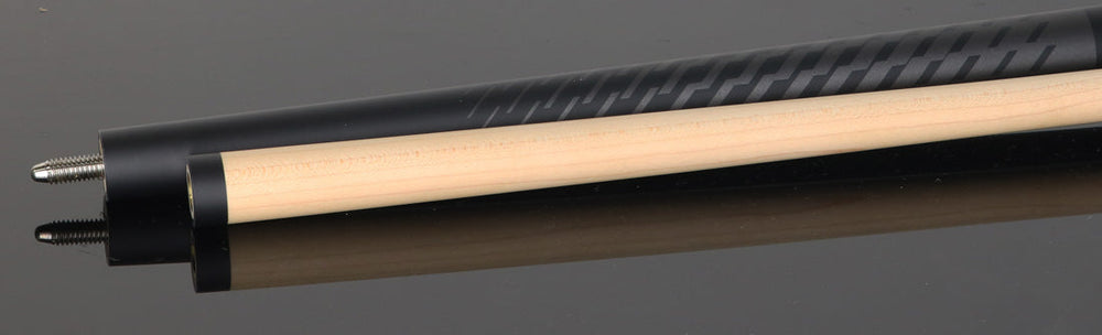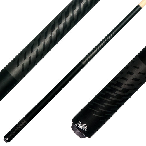 The Dufferin DOE101 No Wrap Pool Cue features a sleek matte black and gray weave graphic design on both the forearm and butt sleeve, offering a modern and sophisticated look. Its wrapless matte black handle promotes a smooth slip stroke for enhanced control. The 29" Hardrock maple shaft with a 13mm diameter and full 8–12-inch professional taper ensures consistent, precise play. Equipped with a high-quality Le-Pro tip and a custom 5/16 x 18 joint, this cue delivers reliable performance for discerning players.