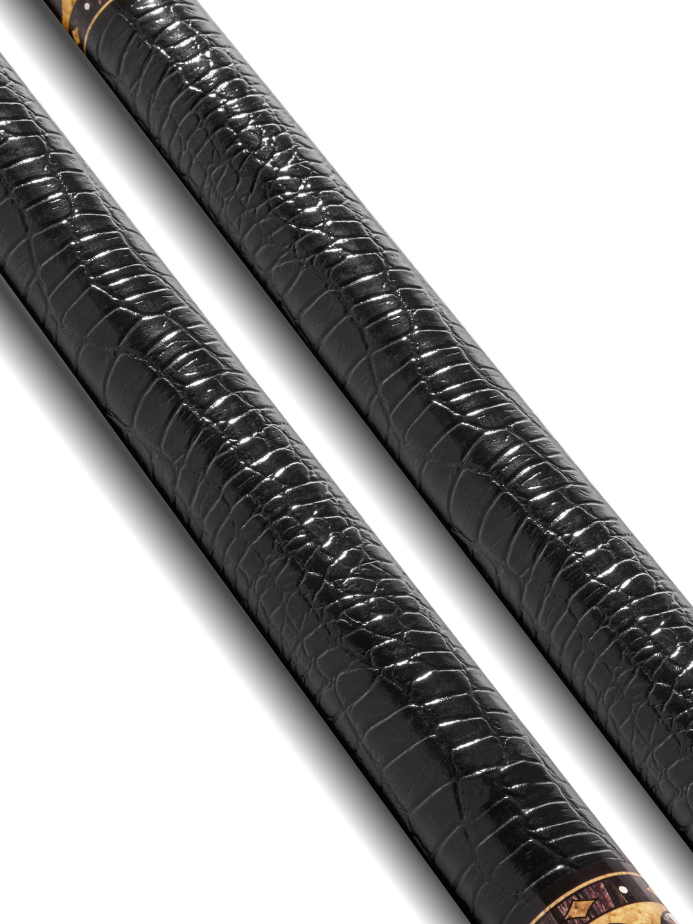 Its luxurious carbon and glass fiber body is wrapped in a graphic overlay of figured oak, accented with white highlights and subtle white buffalo details flowing across forearm and butt sleeve. The 29" carbon fiber shaft with pro taper ensures fluidity and control, while the 10-layer microfiber TIME Standard Tip delivers exceptional feedback. A 12.50mm shaft diameter balances power and finesse, complemented by a black crocodile-embossed microfiber leather wrap. Anchored with a 3/8 x 8" nonstandard radial joint, EVO CROWN is elegance and authority perfected — built for the ruler of the table.