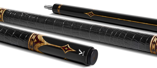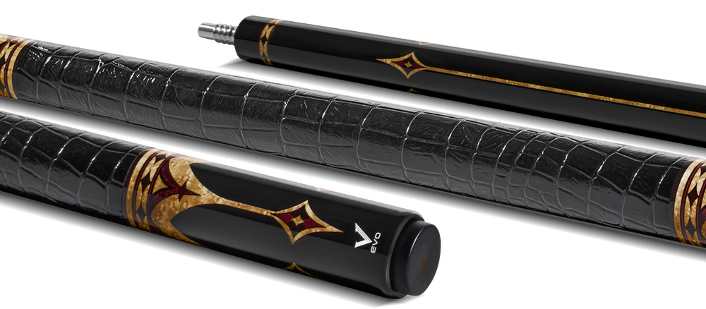 The sleek black carbon and glass fiber construction is accented with a rich graphic overlay of maple points and dark brown highlights that flow across the forearm and butt sleeve. A 29" carbon fiber shaft with pro taper ensures smooth, stable control, while the 10-layer microfiber TIME Standard Tip provides precise feedback. The 12.50mm shaft diameter balances finesse and power, complemented by a black synthetic crocodile leather wrap for luxurious grip. Finished with a 3/8 x 8" nonstandard radial joint, EVO CROWN is elegance weaponized — the cue of those who reign.