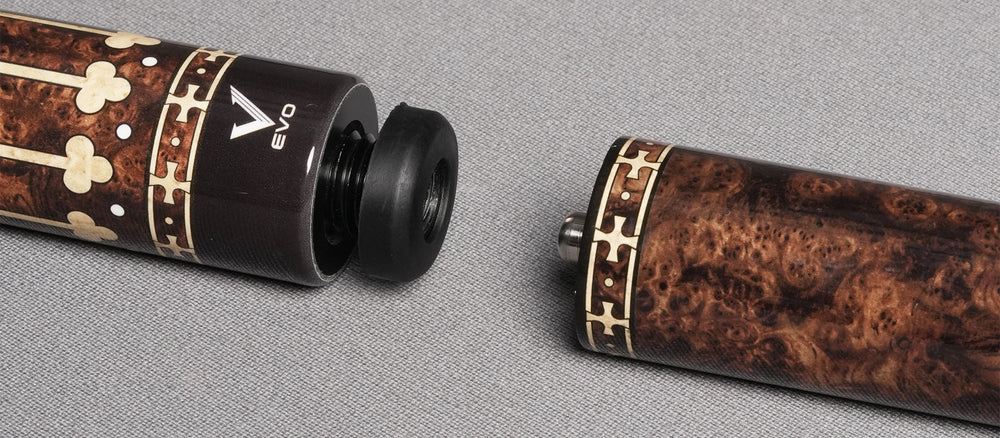 The cue itself is a true work of art, built on a foundation of Carbon and Glass Fiber construction for superior durability and performance. A stunning Birdseye Maple forearm is enhanced with highly figured burl wood points, creating a breathtaking contrast of elegance and depth. The butt sleeve reverses the motif with rich burl wood accented by Birdseye Maple, completing a visually harmonious design. The 29" glass fiber shaft, paired with a refined hybrid pro taper and 12.50mm diameter, delivers accuracy, low deflection, and a silky-smooth stroke. A wrapless handle featuring a full burl wood graphic overlay adds both beauty and natural feel, while the 3/8 x 10 stainless steel joint ensures a solid, commanding hit. This cue doesn’t just play like royalty—it looks and feels the part.