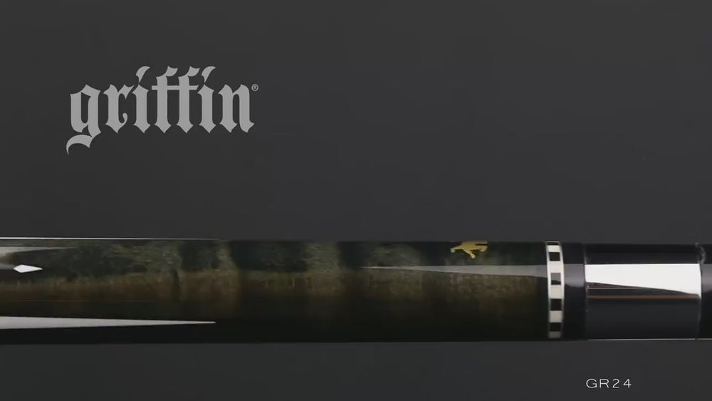 The Griffin Cues GR24 boasts dark gray stained hard rock maple, with floating diamond-like ebony and cream colored designs, creating a stunning appearance. The cue features the unique Steel-Tite joint and a high impact chip resistant ferrule, ensuring durability and precision. A pro tapered hard rock maple shaft and an Irish linen wrap complete the design. Each cue undergoes five rounds of turning for a perfectly straight result. This cue also comes with a set of free joint protectors.