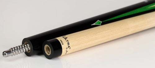 This Jacoby Limited Edition Raven Pool Cue is a rare collector’s gem, limited to just 12 pieces. Its ebony forearm and butt feature an elegant design of four long and four short maple points, outlined in striking orange and black veneers. Pearl dots accent the short points, while orange diamonds crown the long points. The split wrap combines black and red stacked leather, separated by an exquisite ebony piece adorned with four orange diamonds framed in white Elforyn and 34 jeweler’s dots. Equipped with a Jacoby Ultra Pro laminated wood shaft, a 12.75mm diameter, Tiger Everest laminated leather tip, a radial joint, and detailed ringwork of jeweler’s dots and pearl circles, this cue blends artistry with superior performance.