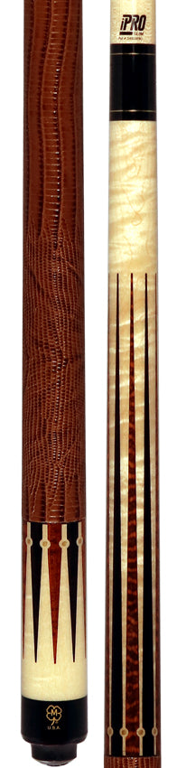 The McDermott MCD50F 50th Anniversary Series cue combines a beautifully figured curly maple forearm and sleeve with 20 snakewood and ebony points, accented by 20 brass dot inlays for timeless elegance. Its brown lizard-embossed leather wrap and brass rings enhance grip and style. Featuring a precise i-Pro Slim high-performance shaft and a 3/8"-10 joint, this cue offers exceptional control and responsiveness. Marked with a "50th Anniversary" logo transfer and accompanied by a commemorative 1x1 case, it celebrates craftsmanship and performance for discerning players.