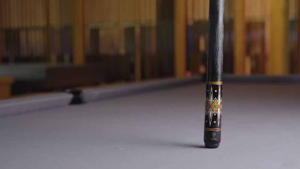 The design showcases a richly figured Birdseye maple forearm flowing seamlessly into a dramatic ebony sleeve, delivering classic contrast and refined elegance. Accented by cocobolo and brass ringwork, the cue features 12 precision-cut points crafted from ebony, cocobolo, malachite, brass, and white urethane, creating a bold yet balanced visual statement. The sleeve is further enhanced with six sets of intricate inlays, blending Birdseye maple, cocobolo, malachite, brass, and white and black urethane for a look that is both complex and harmonious. A black lizard-embossed leather wrap completes the design with a luxurious feel and confident grip.