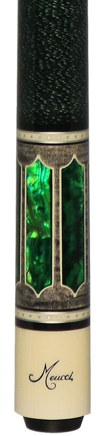 - The forearm of the Meucci 2020 Green Pearl Pro Pool Cue is made from luxurious grey stained curly maple, offering a robust and elegant foundation. This choice of wood not only provides durability but also adds a sophisticated aesthetic to the cue.