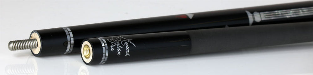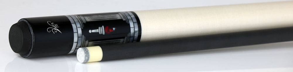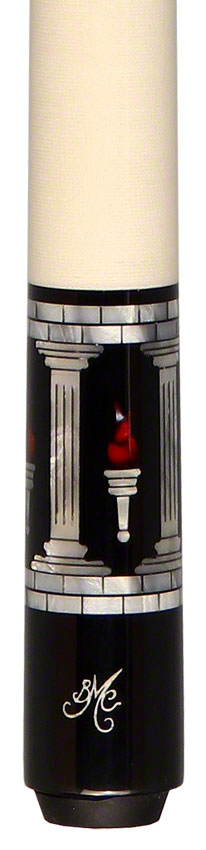 Meucci Pearl Torch Pool Cue. This cue has an ebony-stained forearm with floating White pearl Columns with red pearl lines reaching to the top ending with red pearl torch inlays. The butt sleeve has 4 white pearl columns with 4 ebony-stained windows with floating white pearl torches and red pearl flames. Completing this cue is a solid white Irish Linen wrap and a 12.75mm Meucci Pro Carbon shaft.