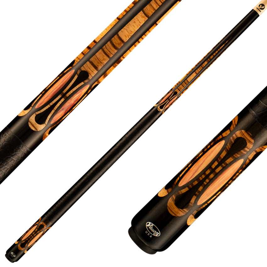 The Viking Ovation Series Ebony Play Cue brings a fresh, playful vibe to your game with its new thinner butt diameter for a sleek, comfy grip. Featuring vibrant stain colors and eye-catching Zebrawood and Tulipwood inlays, this cue stands out in style. It includes a free upgrade to the Vikore Performance Shaft made from aged Hard Rock Maple, giving you extreme control and accuracy. The Gator embossed leather wrap adds a fun texture, while the Tiger Everest laminated tip and Viking SUPER Ferrule ensure top-notch performance. Ready to make every shot a winning one!